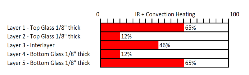 - Charts show how heat is absorbed by a ¼” over ¼” assembly with .060” interlayer when heating from both top and bottom, with IR heaters radiating at a wavelength between 3 and 3.5 microns