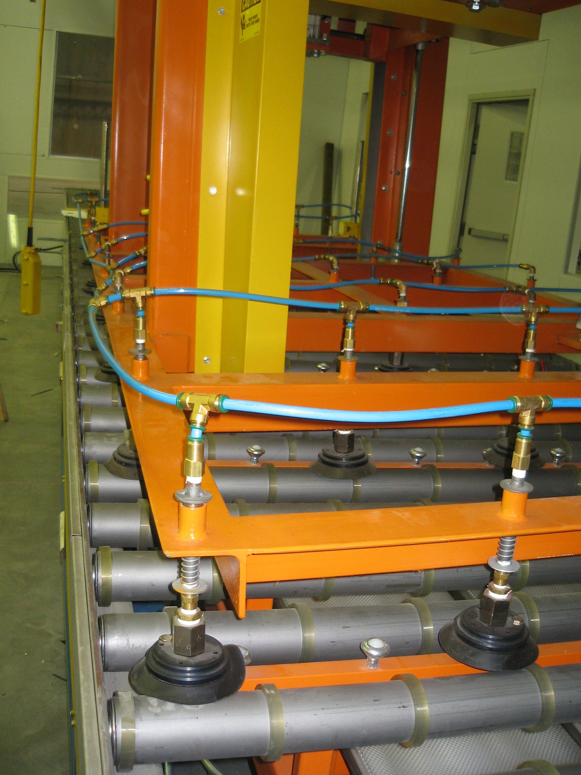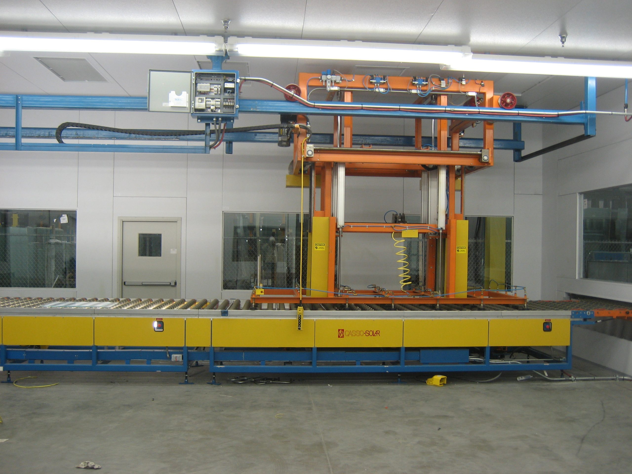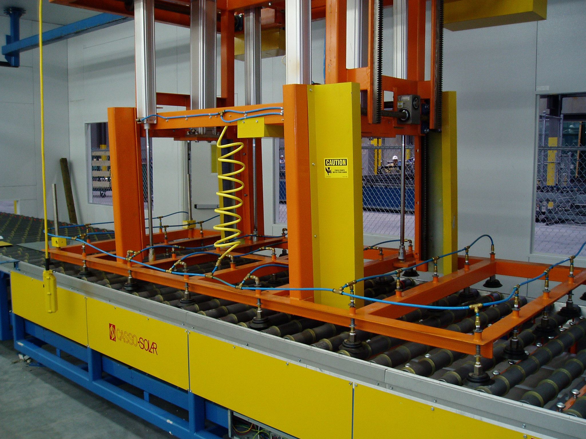 For most glass manufacturers, assembly in the clean room prior to lamination is done by hand. For smaller parts this does not pose an issue, but for larger parts lifting the top lite accurately into place is a challenge. To resolve this challenge Casso-Solar can provide an overhead vacuum lift assist system. The top and bottom lites are registered into position automatically on the assembly conveyors in the cleanroom, and then the overhead system picks the top lite up and places it accurately aligned onto the bottom lite.